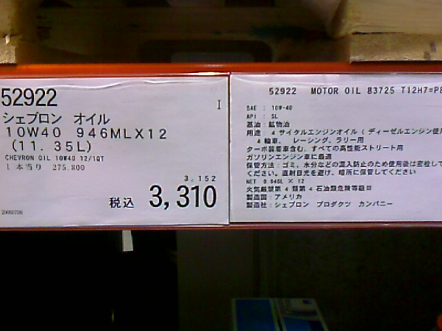 「CHEVRON OIL 10W40」 ダンボール売りです!