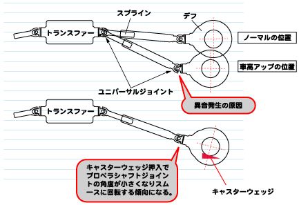 リフトアップによるトランスファーとデフの角度の付きすぎが問題とのご様子。